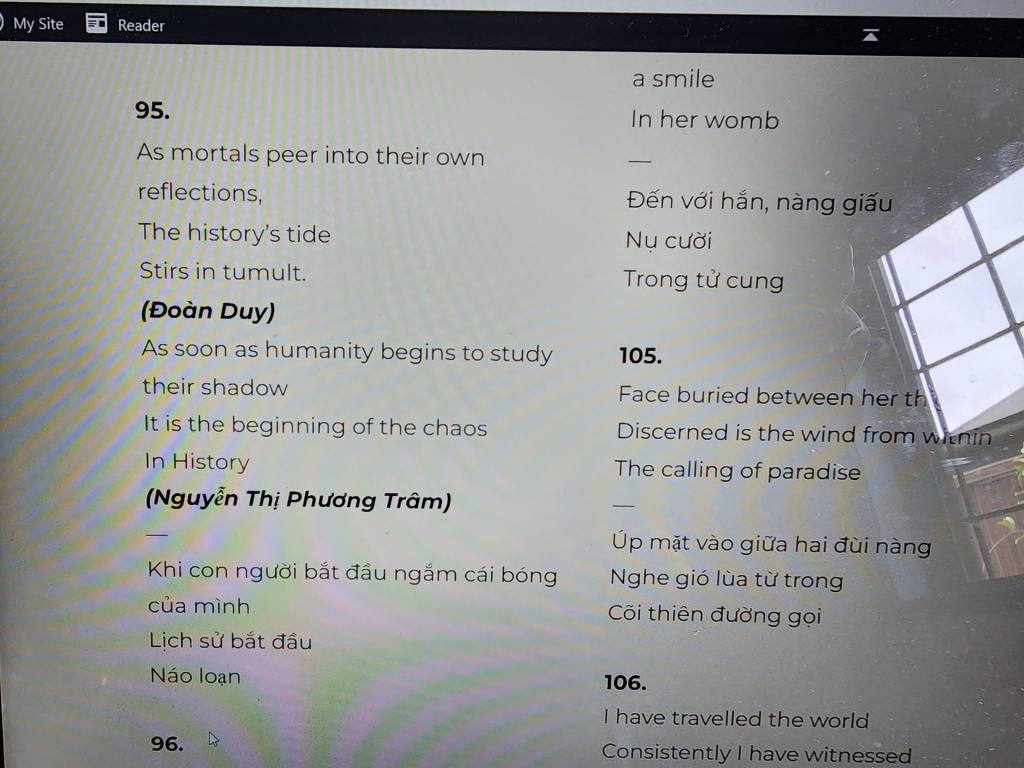 When poetry is good, depending on my mood, it comes to me. What makes me uncomfortable were the poetry I was invited to read and the unexpected gifts of poetry, the books of poems. The unanticipated pressure within a space I have set aside to learn Vietnamese.